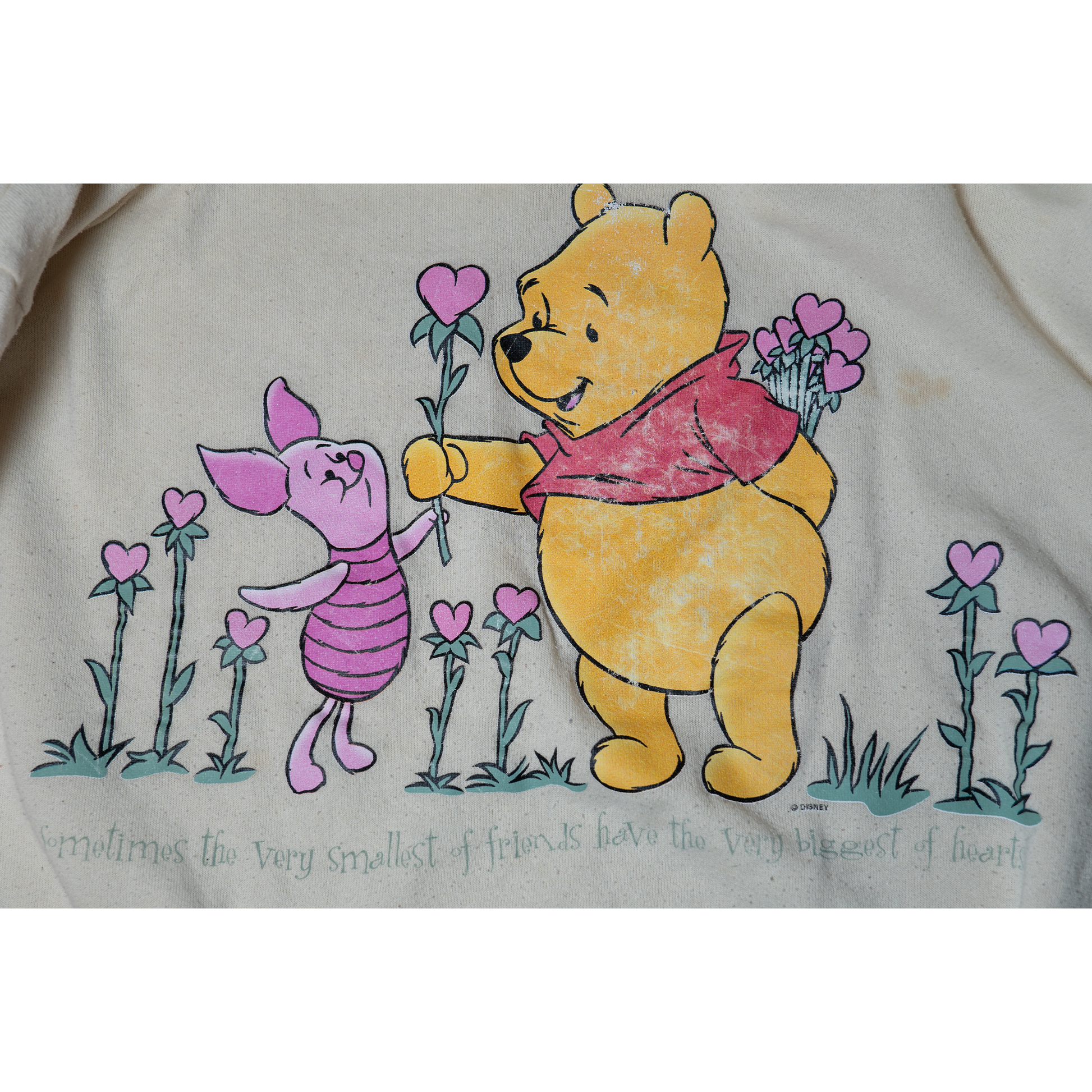 プーさんがピグレットにお花をプレゼントする愛らしいシーンがプリントされたオーバーサイズスウェットです。