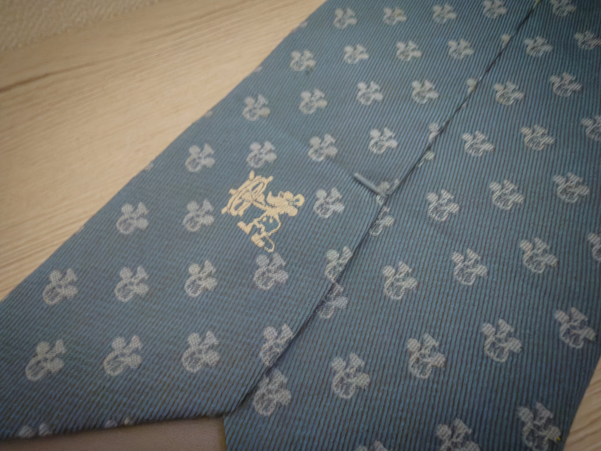 ミッキーの原点ともいえる蒸気船ウィリー(Steamboat Willie)がデザインされた高級感と使い回しの良いインディゴネクタイ!