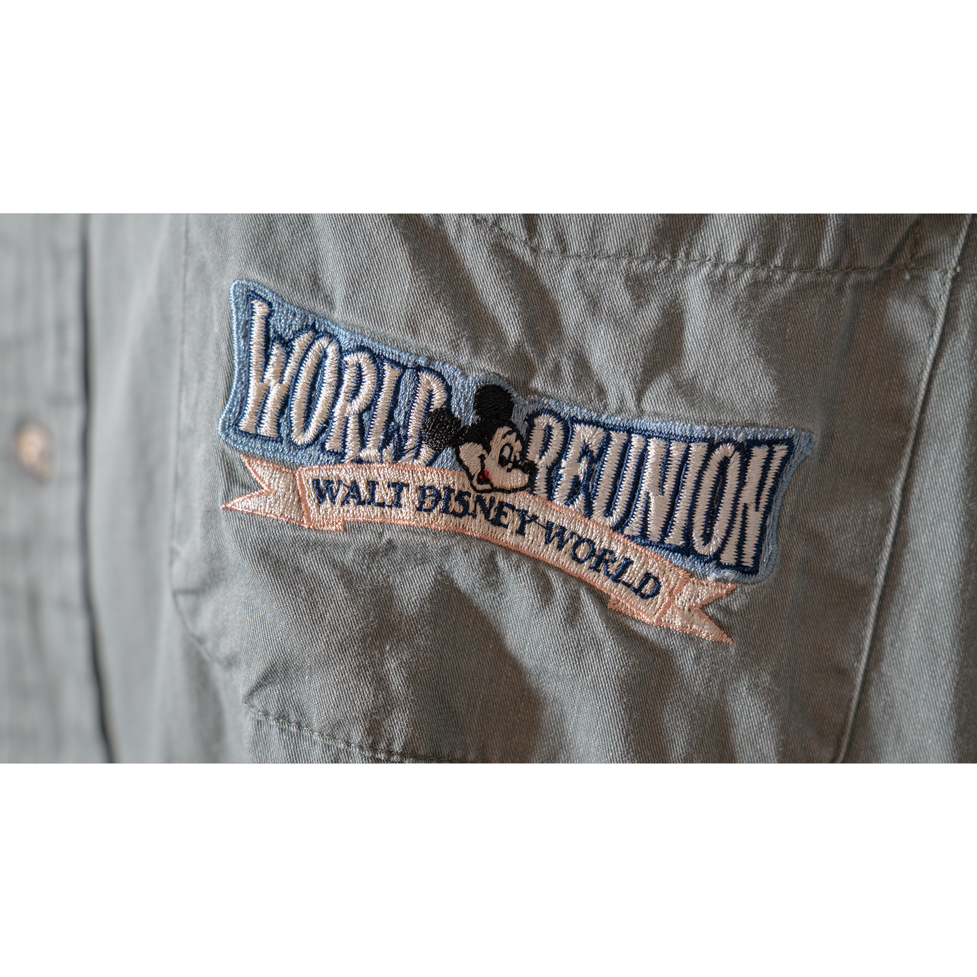 ウォルトディズニーワールド提携リゾートの“World Reunion(ワールド・リユニオン)”のロゴが刺繍されたグレーシャツ。