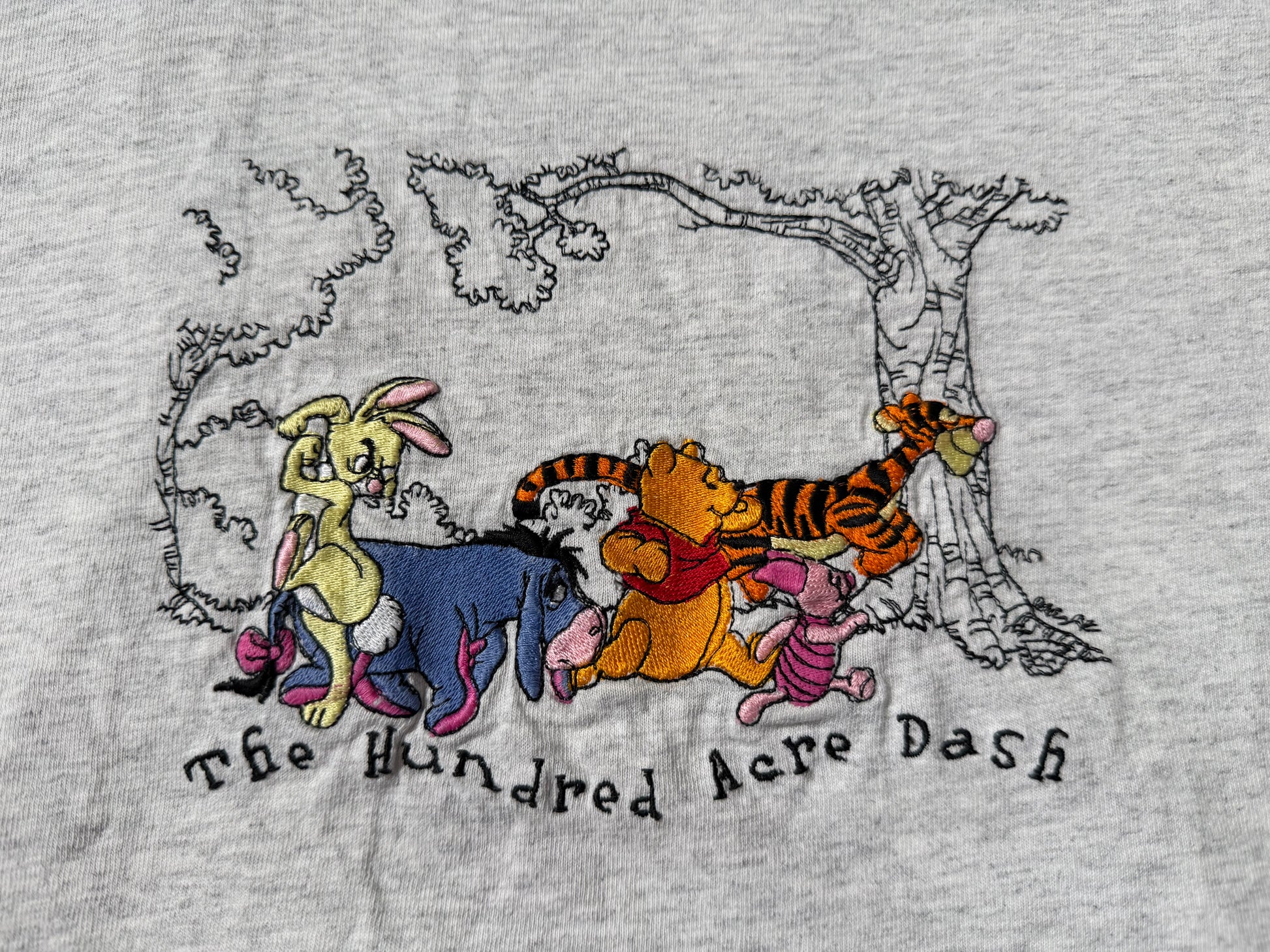 胸元には「the hundred acre dash」の文字入りで、90年代らしいゆるさがあります。
