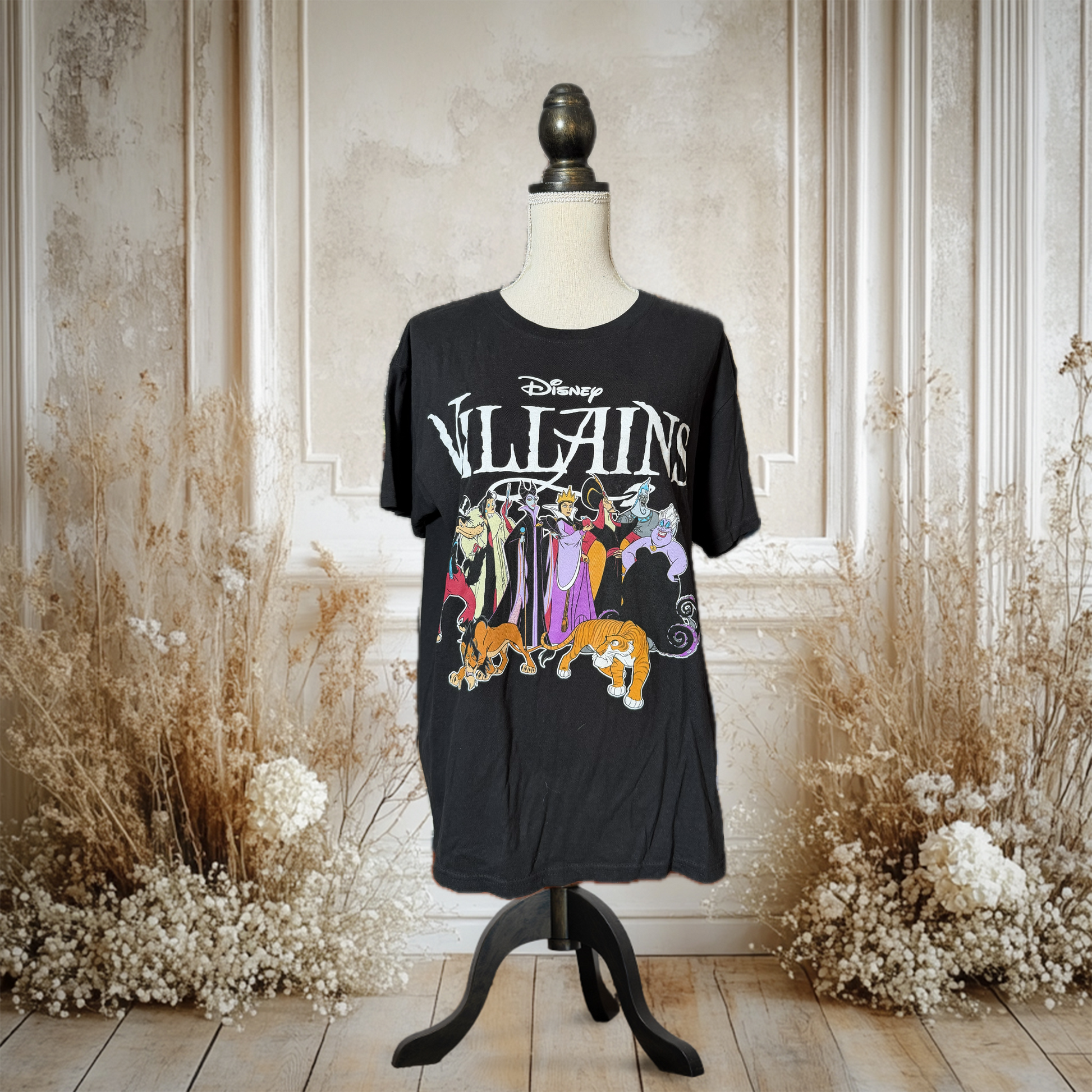 ディズニーの悪役たちが勢ぞろいしたヴィランズデザインTシャツです。