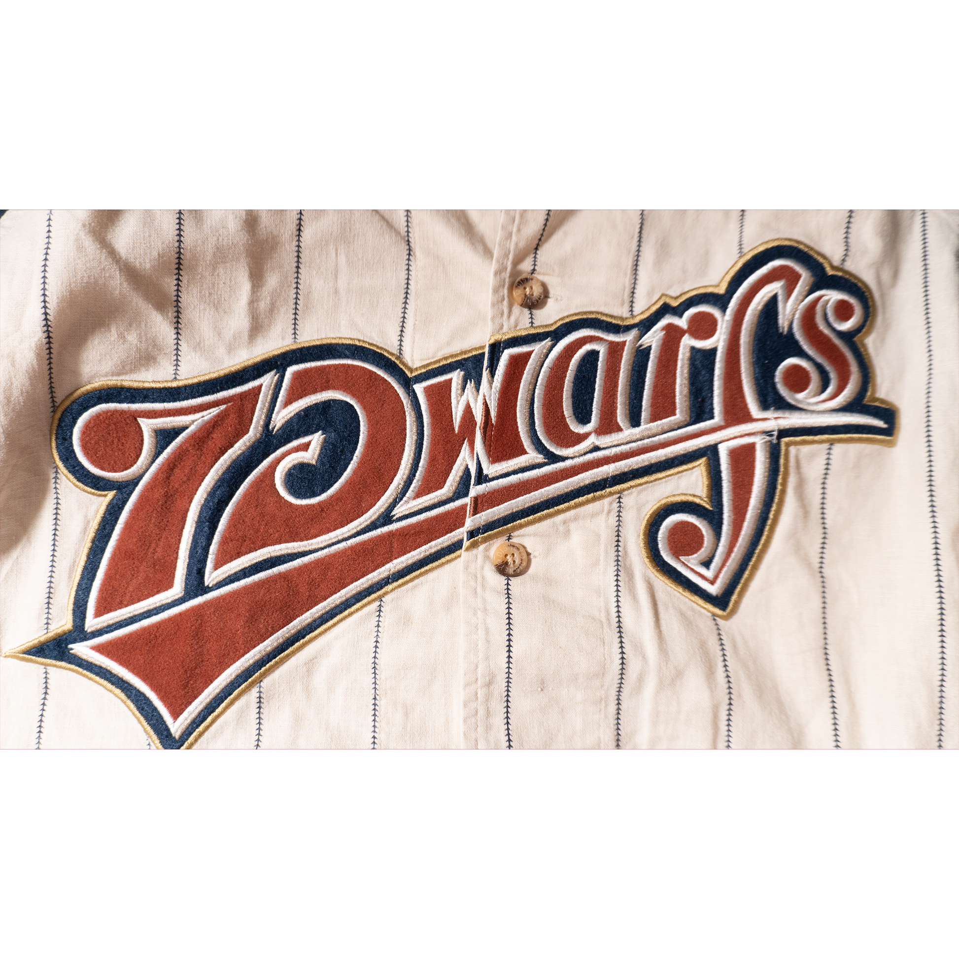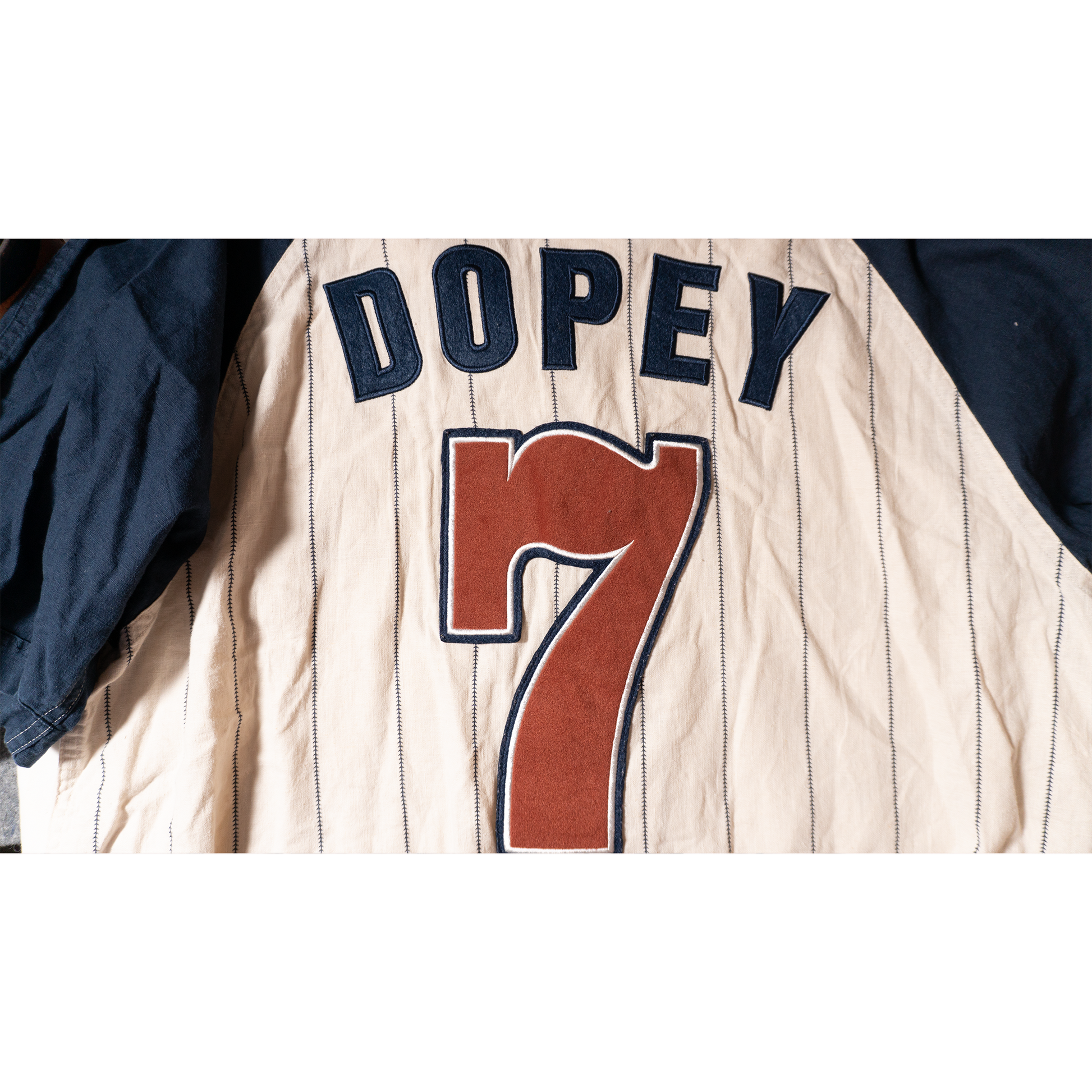 生成り×ネイビーのピンストライプに、フロントは立体フェルト刺繍の「7 Dwarfs」、裾にDopeyワッペン、裏面はロゴ「DOPEY」&背番号7のビッグフェルトが映える一着です。 袖の「MINER LEAGUE BASEBALL」パッチなど小ネタも◎