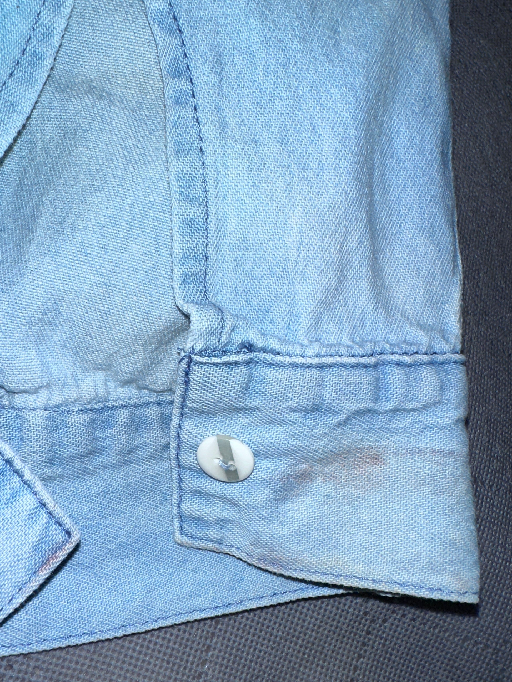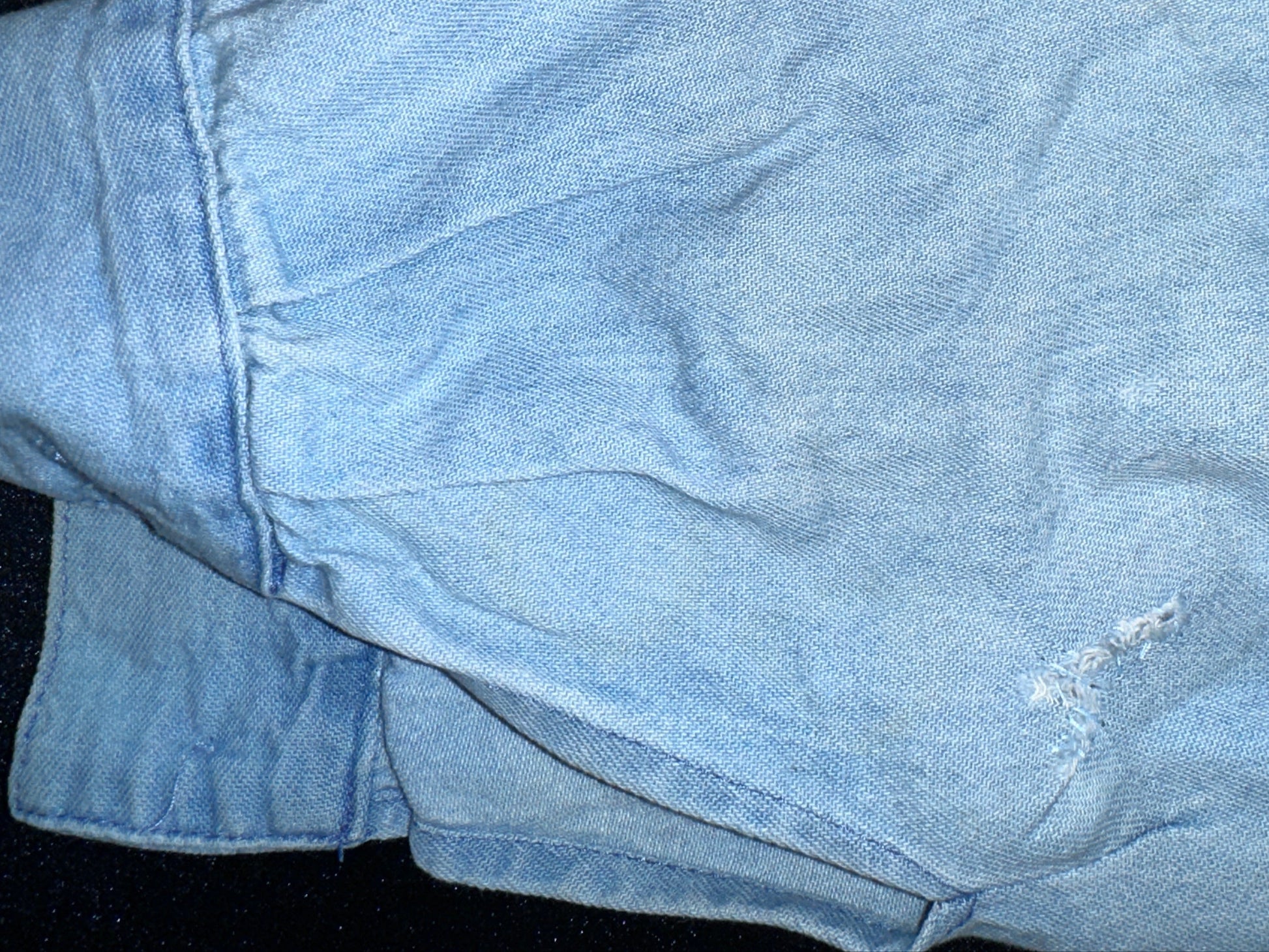 おそらく90年代製のデニムシャツなので、袖部分破け(補修済)、袖部分汚れ(漂白済)、裾部分穴(補修済)がございます。