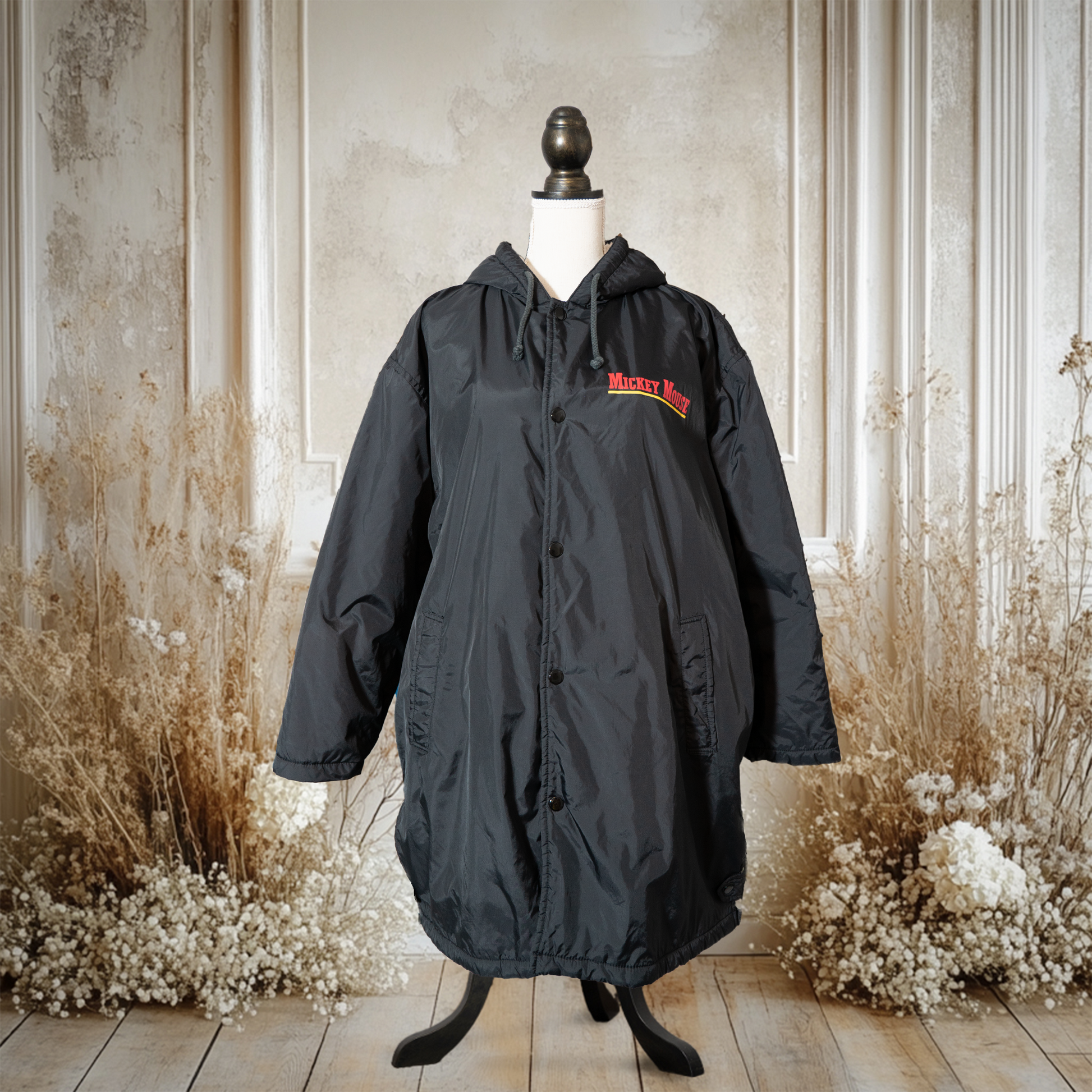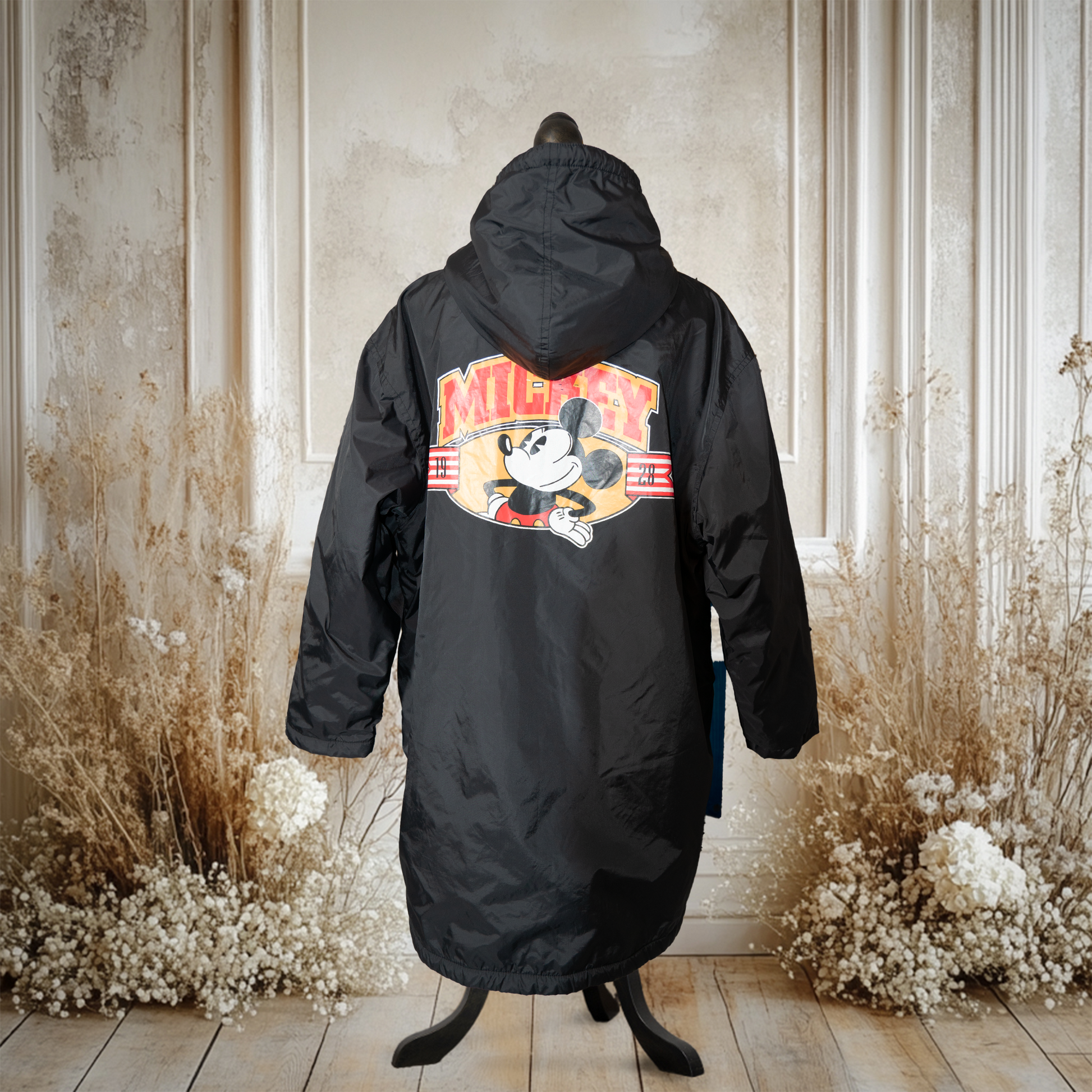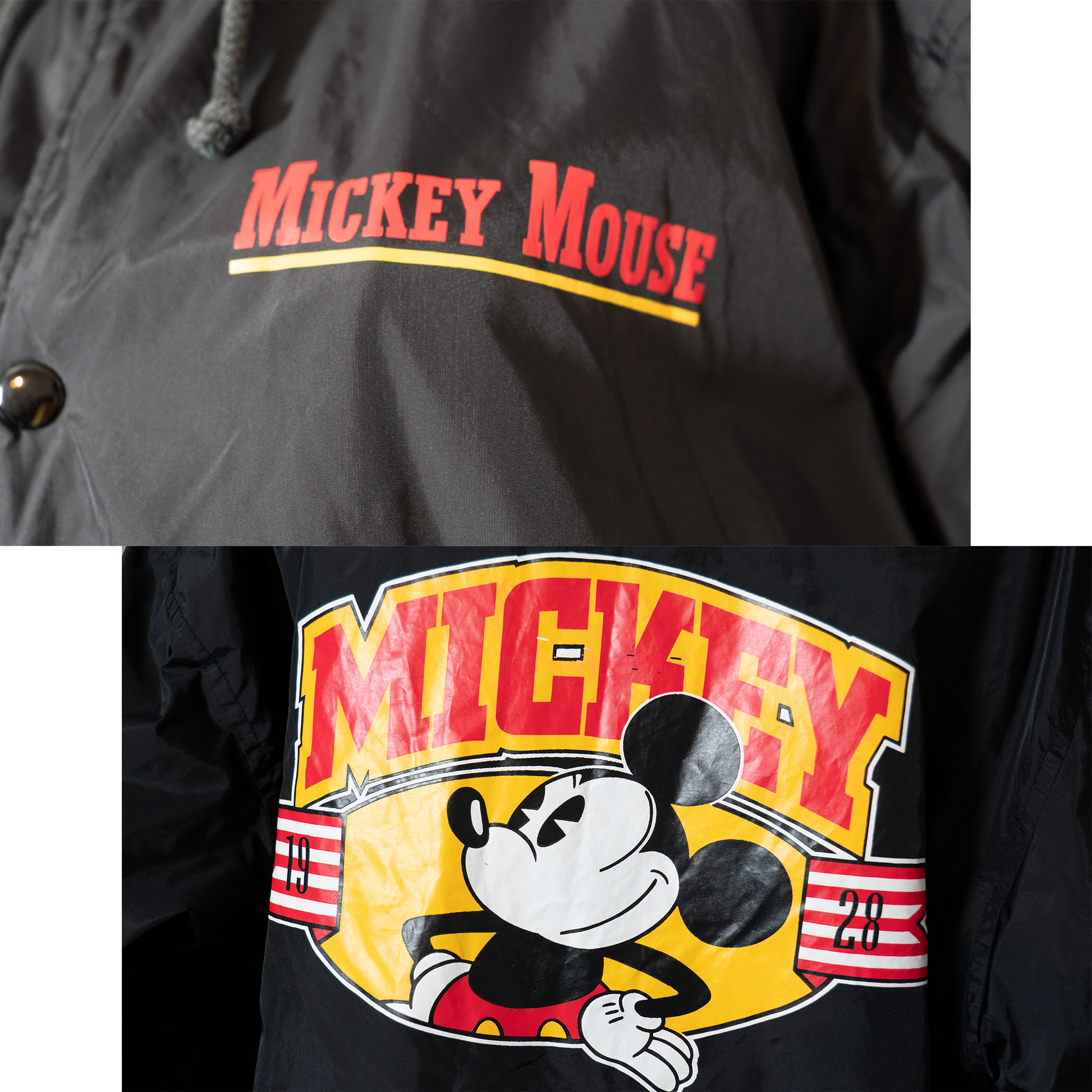 ディズニーのアウターとしては珍しい海外製デザインで、フロント部分は普段のコーデにさりげなくキャラクター感を取り入れられるワンポイント仕様、バックプリントは人気のパイカットミッキー!