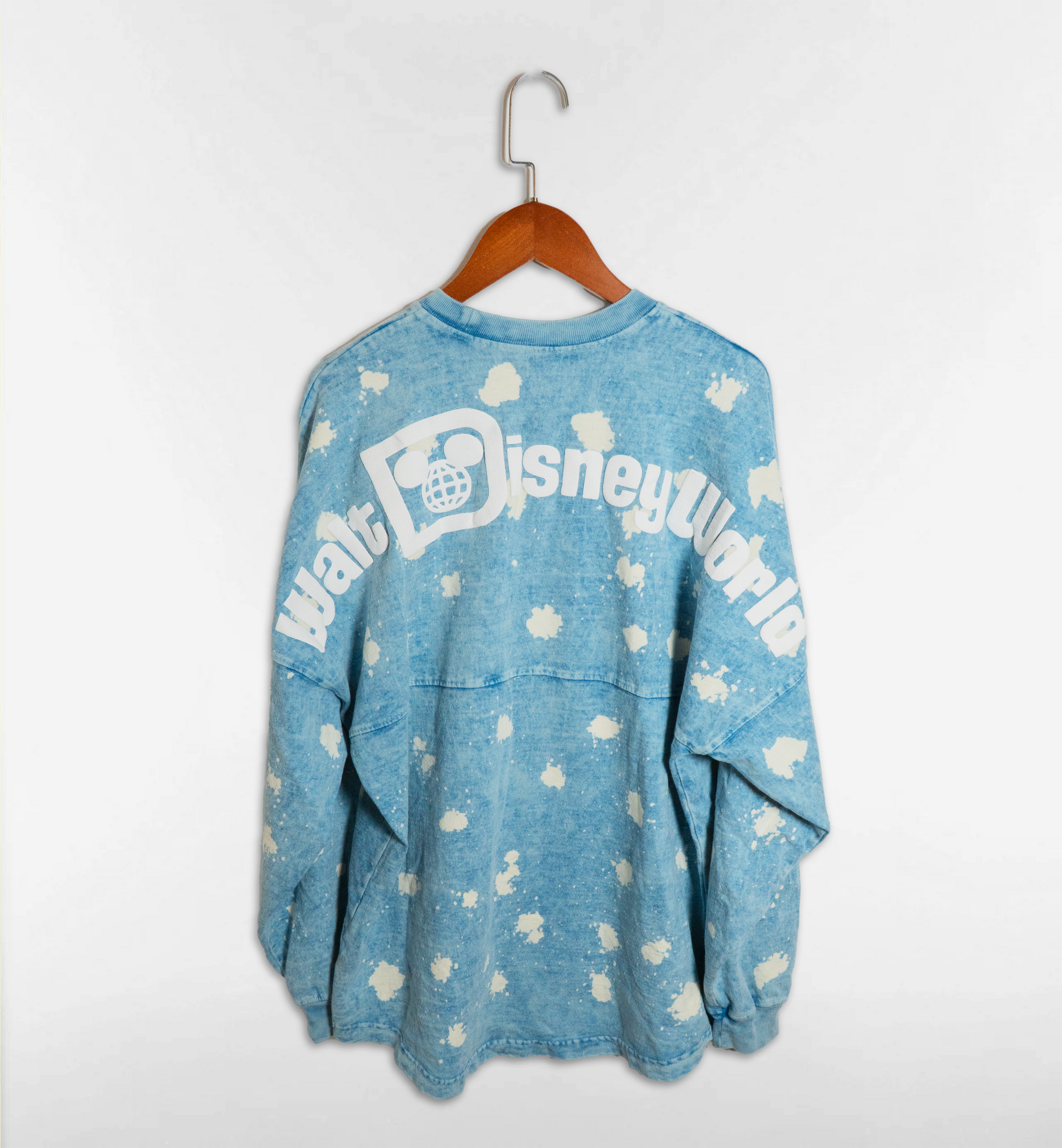 ライトブルーのデニム調ボディに、白いブリーチ風のスプラッシュ柄が全体に広がるスピリットジャージー。