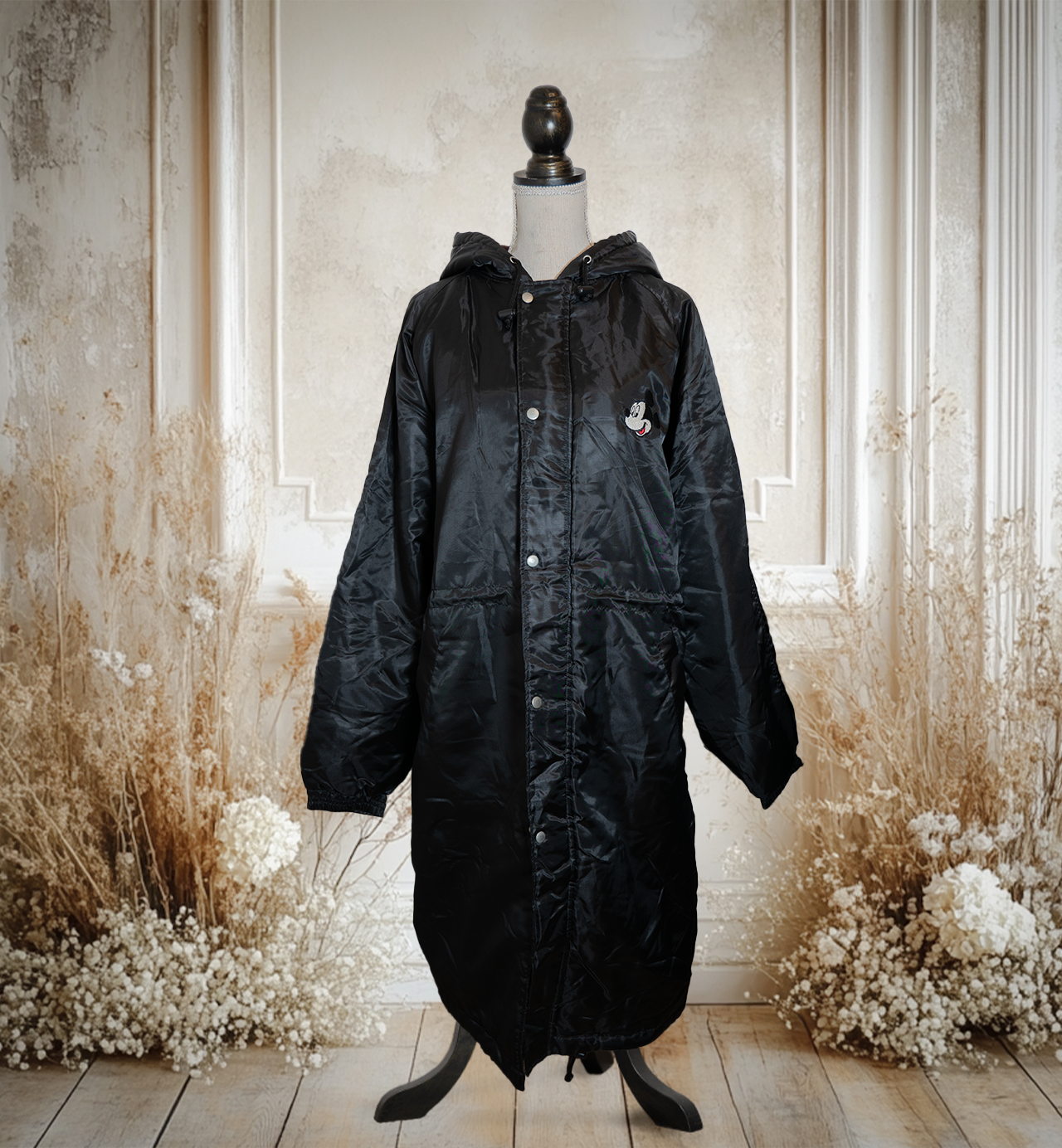 バックには大きくミッキーが描かれ、スポーティーなロゴと組み合わさった存在感のあるデザイン。ドローコードでシルエットの調整もできる、寒い時期の主役アウターとして活躍するベンチコートです。