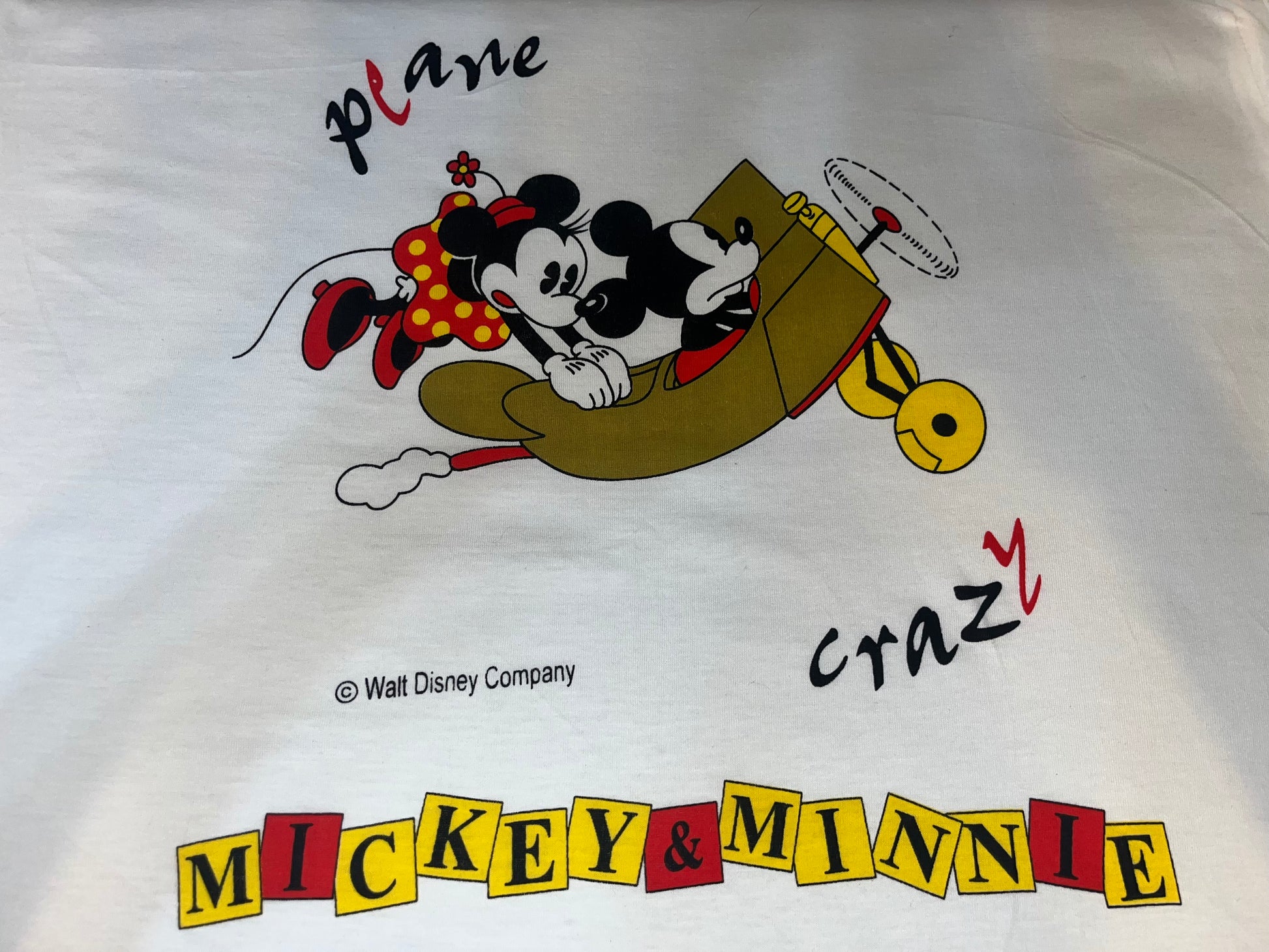 1928年に制作1929年に公開されたプレーンクレイジーの貴重なレギュラーTシャツになります。蒸気船ウィリーよりも前に製作された映像作品でもあります。キッズTには男性でも着られるサイズ感