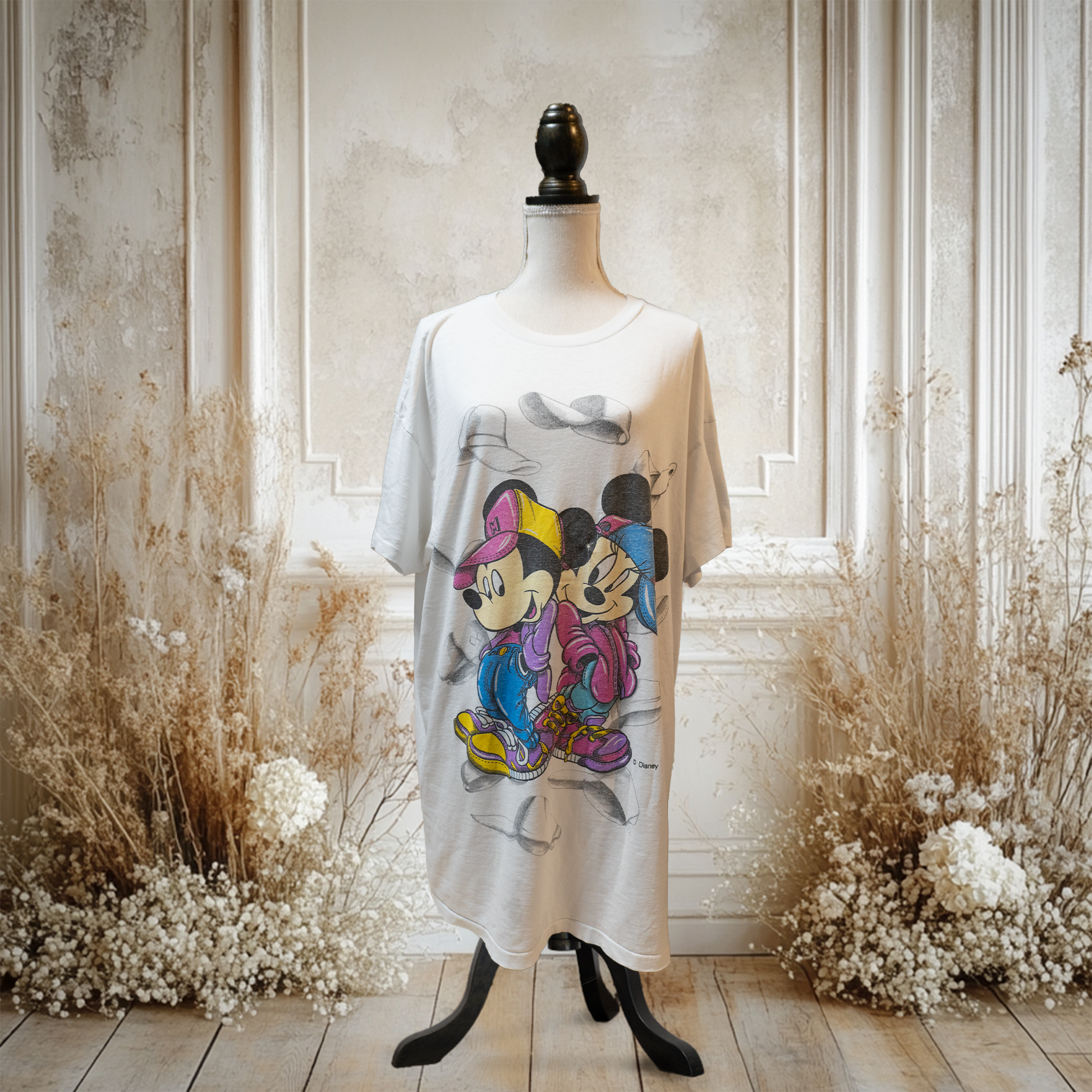 ミッキーとミニーがストリートライクなファンションをしている謎に帽子が印刷されているTシャツです! タグが擦れていますがアンリミテッド製の90'sアイテムです! 身丈が長めなので小柄な肩ならスリーピングシャツとして使ったり